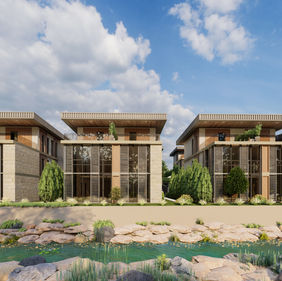Yapı kütleleri, araziye yayılmış bir yerleşim düzeniyle konumlandırılarak hem mahremiyet hem de ferah bir yaşam alanı sunar. Her bir konut, özel bahçeleri ve açık alanlarıyla iç mekân–dış mekân sürekliliğini güçlendirirken; geniş açıklıklar ve doğal ışık kullanımı mekânların gün boyu canlı kalmasını sağlar.